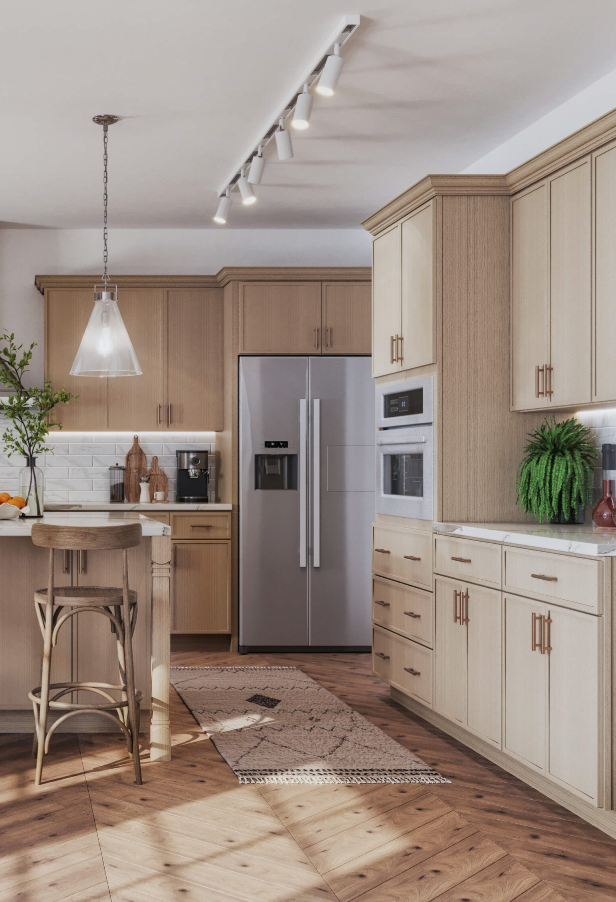 Elevate your kitchen with our exquisite cabinets. Crafted from high - quality wood, the warm, natural wood grain finish adds a touch of elegance and coziness. Paired with a sleek, modern countertop and a durable stainless - steel sink, this combination not only offers functionality but also a contemporary aesthetic. Ideal for those who seek both style and practicality in their kitchen space